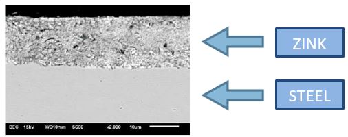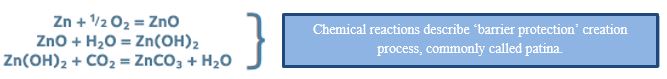 The zinc coating has another advantage: the ingredients under the influence of the atmosphere (oxygen, carbon dioxide, water), create a thin surface layer of a water-insoluble zinc carbonate, commonly called patina, which comprises so called barrier protection.