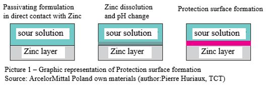 Passivation process involves the formation of layer which, on the surface of galvanized steel conversion, is formed by the electrochemical reaction of the metallic coating with passivating formulation, as shown in graphics.